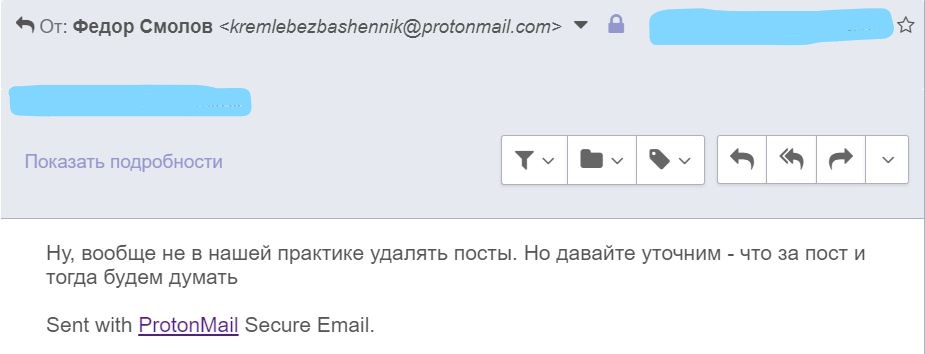 В пользу этого говорит тот факт, что, когда у «Руспреса» был популярный канал «Футляр от виолончели» с более чем 400 тысячами подписчиков, то его админы могли пойти на удаление старого контента за деньги. В качестве эксперимента мы написали в канал «Кремлевский безбашенник», попросив снести старый пост от конца 2019 года, выбранный совершенно случайно. «Вообще не в нашей практике удалять посты. Но давайте уточним — что за пост и тогда будем думать», — спросил админ.